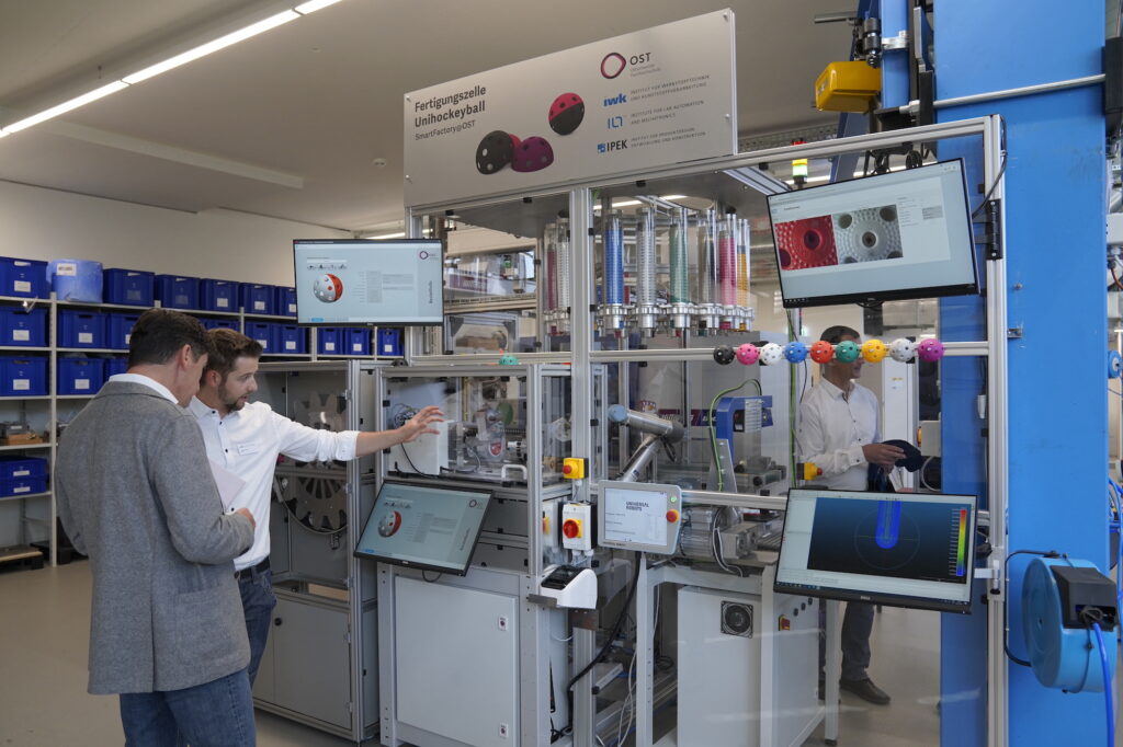 Neu ist nicht nur der Name der Hochschule, auch der Techpark, das Zuhause des IWK Institut für Werkstofftechnik und Kunststoffverarbeitung, ist neu. Fast unbemerkt ist das gesamte Institut mit seinem grossen Maschinenpark und den zahlreichen Labors vom Campus im Pandemiesommer 2020 in den neuen Techpark umgezogen. Prof. Dr. Frank Ehrig, Institutsleiter IWK, führte aus, was das für neue Möglichkeiten für die Lehre und angewandte Forschung und Entwicklung bietet und wie diese Synergien genutzt werden können. Ein besonderes Augenmerk legte er auf die neue Fertigungszelle zur Herstellung eines Unihockeyballs, die die Möglichkeiten der Digitalisierung und Machine Learning praxisnah erlebbar macht. Hierbei verwies er auf die sehr gute Zusammenarbeit mit den beiden anderen Instituten der Abteilung Maschinentechnik, dem IPEK Institut für Produktdesign, Entwicklung und Konstruktion und dem ILT Institut für Laborautomation und Mechatronik.