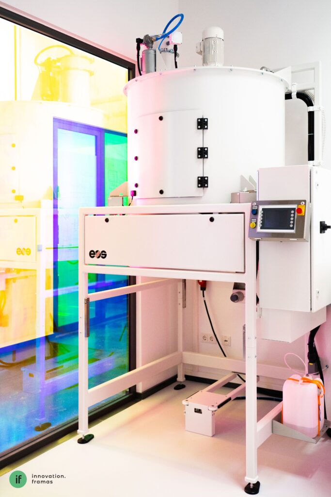 An das „EOS P 396“-System wird eine Peripherie angebunden, die das optimale Mixen des Materials für eine konstante Prozessqualität ermöglicht; dabei handelt es sich hauptsächlich um Polyamid (PA 11 und PA 12) und Thermoplastisches Polyurethan (TPU) in Pulverform. framas arbeitet bereits eng mit Maschinenherstellern und Materiallieferanten zusammen, um neue Materialien zu testen und zu evaluieren.