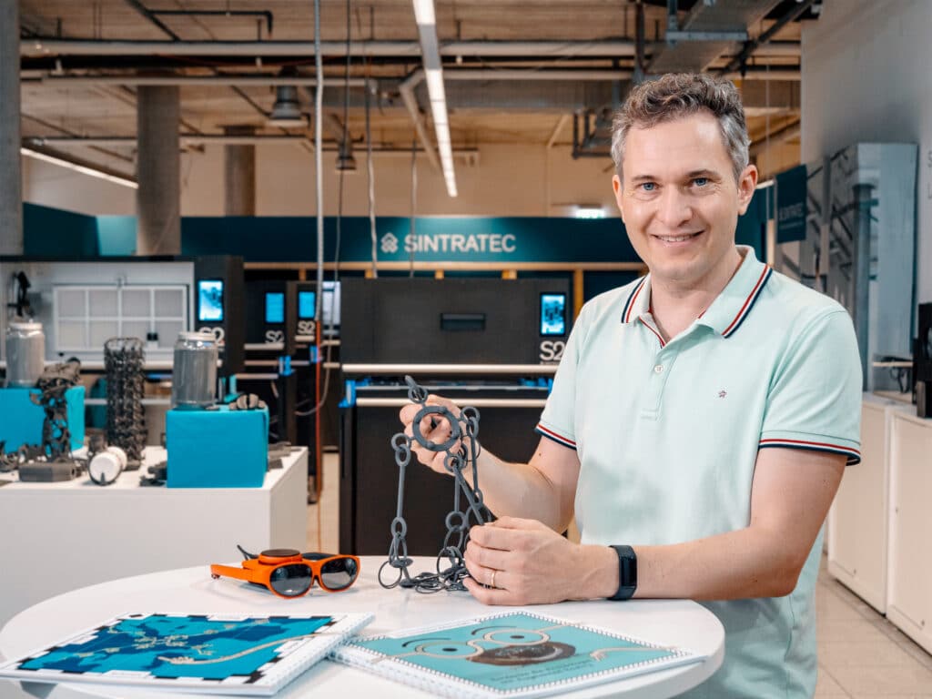 Der Kettenverteiler wurde schliesslich aus stabilem PA12 Material auf dem Sintratec S2 System gedruckt. Das selektive Lasersintern (SLS) erwies sich für Jonas Christen als ideales Verfahren: «Die Sintratec-Technologie ermöglicht uns eine sehr detaillierte Darstellung der äusserst feinen Aspekte des Objekts», betont er. «Die Genauigkeit, die Robustheit und die Haptik des SLS-Drucks waren für uns entscheidende Faktoren.» Die SLS-Kette konnte im ersten Feldtest die Schülerinnen und Schüler begeistern und so erfolgreich zur Wissensvermittlung beitragen. Gerade diese spannende Kombination von Augmented Reality und 3D-gedruckten Teilen könnte also durchaus ihren Weg in zukünftige Klassenzimmer finden.