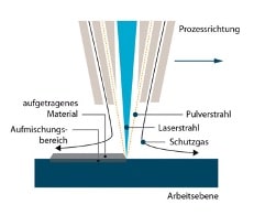 Der Laserstrahl erzeugt eine hohe Temperatur und damit ein Schweissbad auf der Substratoberfläche. Gleichzeitig wird das Pulver durch eine Düse in das Schweissbad welches das Pulver absorbiert, geleitet und schmilzt im Schweissbad. Das Schweissbad wird ebenfalls mit einem Schutzgas wie Argon abgeschirmt [1, 2]. Die Schmelze erstarrt sobald die Wärmequelle entfernt wird, denn ohne den Laserstrahl gibt es keine lokale Wärmezufuhr mehr. Die Abkühlung erfolgt durch Konvektion, Wärmeleitung in der Umhüllung und Temperaturstrahlung. [3].