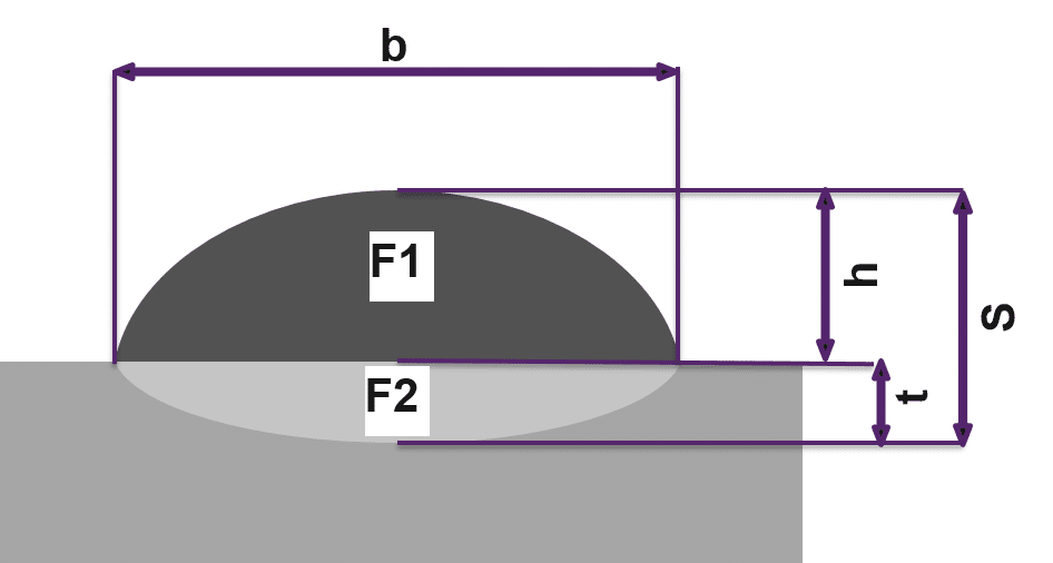 Der Aufmischungsgrad beschreibt, wie gut sich das Schweisspulver mit dem Substrat vermischt hat und ist ein Messwert für die Qualität der Schweissung [6]. Ziel des Beschichtungsprozesses ist es, die Querschnittsfläche auf dem Substrat (F1) zu maximieren und die Querschnittsfläche der Mischzone (F2) so zu minimieren, dass das Werkstück und Substrat noch fest miteinander verbunden sind. (Siehe dazu die Abbildung 2.) Qualitativ hochwertige und effiziente Schweissnähte zeichnen sich durch einen Mischungsgrad zwischen 5% und 30% aus (Gleichung 2) [2, 5]: