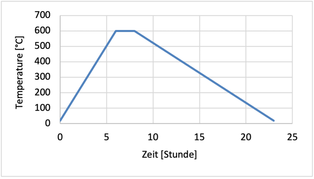 Das Ziel des Anlassens ist im Allgemeinen der Abbau von thermischen Eigenspannungen. Bei einer Temperatur von 600 °C werden Eigenspannungen in CK45 abgebaut. Beim Anlassen ist es wichtig, dass sowohl der Aufwärm- als auch der Abkühlprozess richtig und präzise durchgeführt werden [8]. Abbildung 3 zeigt den gesamten Ablauf zum Anlassen, der in dieser Untersuchung angewendet wurde. Die Aufheizrate beträgt 100 °C/Stunde, die Haltezeit 2 Stunden bei 600 °C und die Abkühlrate 40 °C/Stunde.