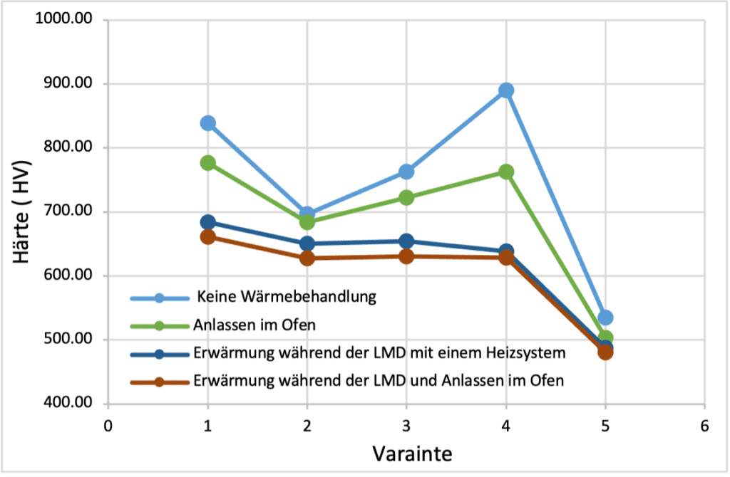 Die Messungen haben gezeigt, dass die Härte immer dann am höchsten ist, wenn die Probe nicht wärmebehandelt wurde. Die Härte nimmt ab, wenn die Probe sowohl während des LMD-Prozesses als auch beim Anlassen erwärmt wird, aber es ist auch zu erkennen, dass die angelassene Probe härter ist als Proben, die durch den LMD-Prozess erwärmt werden. Die Mindesthärte wird erreicht, wenn sowohl die Erwärmung während des LMD-Prozesses als auch der Anlassprozess angewendet wird. Abbildung 4 zeigt die Ergebnisse der Härteprüfung der Proben.