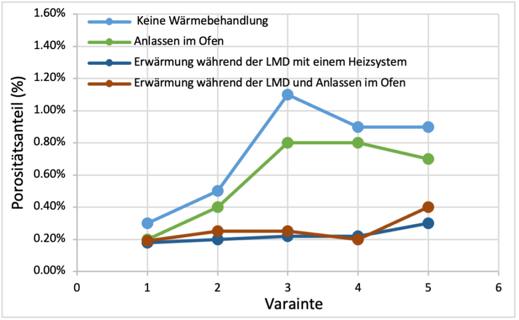 Die bei dieser Untersuchung beobachteten Fehlstellen sind meist auf Gasporosität (kugelförmig) zurückzuführen. Abgesehen von den nicht wärmebehandelten Proben wurden keine Qualiätsprobleme wie Lunker oder Risse in den Proben gefunden. Wie in Abbildung 5 zu sehen ist, hat die Erwärmung während des LMD-Prozesses die grösste Auswirkung auf die Verringerung der Porosität. Damit konnte der der Porositätsanteil auf weniger als 0.3 % gesenkt werden.