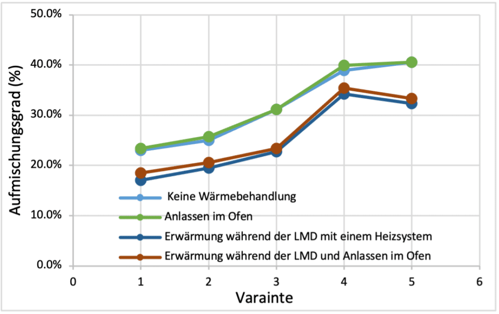 Der Aufmischungsgrad wird durch die Erwärmung während des LMD-Prozesses bei allen Varianten extrem verbessert. Dies zeigt erneut den positiven Einfluss der Erwärmung während des LMD-Prozesses auf die Qualität der abgeschiedenen Materialien und folglich auf die Qualität des Werkstücks.