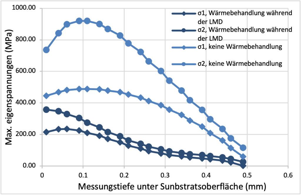 • Die Erwärmung während der LMD hat einen grossen Einfluss auf die Verringerung der Eigenspannungen des Werkstücks.