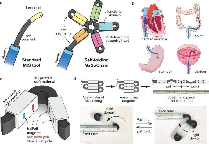Die Grafik zeigt schematisch auf, wie das Ganze funktioniert. a Darstellung eines Standard-MIS (minimalinvasive Operation)-Werkzeugs und einer sich selbst faltenden MaSoChain. Die MaSoChains können sich an der Katheterspitze selbst zu grossen Einheiten mit mehreren Funktionsbereichen zusammenfalten. b Mögliche Anwendungsszenarien für MaSoChains. Wenn sie aus dem Hüllkatheter (blau markiert) herausgeschoben werden, können sich MaSoChains in relativ offenen Kammern des menschlichen Körpers (z. B. Herzkammern, Dickdarm, Magen, Blase) zu grossen funktionellen Strukturen (farbiger Stern) falten. c Die grundlegende selbstfaltende Einheit von MaSoChains, bestehend aus starren Segmenten (weiss), die durch weiche Segmente (schwarz) verbunden sind. Kleine NdFeB-Magnete sind auf der gleichen Höhe wie die umgebende Oberfläche eingebettet. d (oben) Eine schematische Darstellung der Vorbereitung der MaSoChains. Nach dem Zusammenbau der kleinen Magnete werden die MaSoChains gestreckt und im Inneren des Hüllrohrs platziert, wo elastische und magnetische Energien gespeichert werden. (unten) Der Faltvorgang der MaSoChain wird eingeleitet, wenn ein neues Segment aus dem Hüllrohr herausgeschoben wird. Die elastische Energie (die in dem weichen Segment gespeichert ist) faltet die MaSoChain, und die magnetische Energie sorgt für eine stabile Anordnung (markiert als der starre Bereich). Die MaSoChain wird durch Zurückziehen und Führen des festen Rohrs demontiert. Der Massstab ist 5 mm.