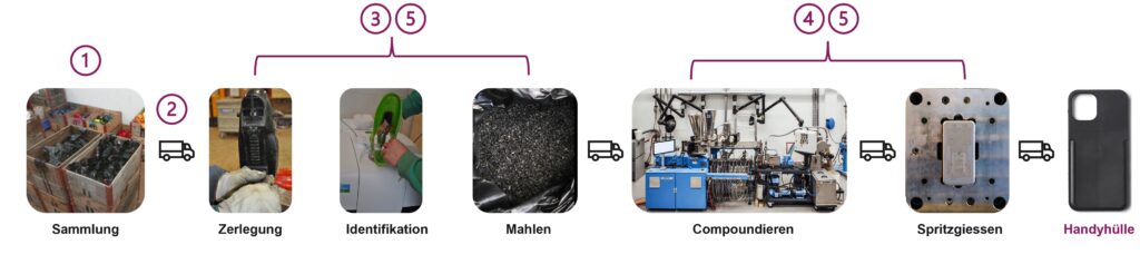 Die Prozesskette des Circ-Case ist in Abbildung 1 dargestellt. Der Prozess beginnt mit der Sammlung ausgedienter Skischuhe an diversen Sammelstellen in der Schweiz. Die Skischuhe werden dann auf Europaletten zur Argo Werkstätte nach Davos transportiert (1). Sämtliche Transportschritte in der Prozesskette finden mit Kleintransportern statt (2). Nach Ankunft bei der Argo werden die Skischuhe manuell zerlegt, die Teile, welche aus TPU bestehen identifiziert und in einem zweistufigen Prozess zu Mahlgut verarbeitet (3). Der darauffolgende Compoundier- und Spritzgiessprozess findet bei Partnerunternehmen in der Ostschweiz statt (4), bevor die fertige Handyhülle in den Freitag-Store in Zürich geliefert wird. Prozessverluste wurden für sämtliche Prozessschritte gemäss Erfahrungswerten berücksichtigt (5).