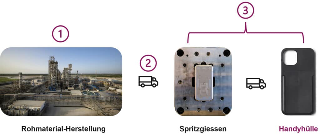 Für die Hülle aus Primärmaterial wurde angenommen, dass das Virgin-TPU in Deutschland hergestellt wird (1) und anschliessend in der Schweiz weiterverarbeitet wird (3). Für den Transport des Rohmaterials in die Schweiz wurde angenommen, dass dies mit einem LKW mit höherer Ladekapazität erfolgt (2). Die einzelnen Prozessschritte sind in Abbildung 2 dargestellt. Sämtliche Annahmen für die Herstellung der Hülle aus Primärmaterial wurden so gewählt, dass sie sich möglichst positiv auf die Hülle aus Primärmaterial auswirken. So wurde bewusst nicht angenommen, dass das Rohmaterial in Asien hergestellt wird, um etwaige Nachteile durch einen weniger «grünen» Strommix zu vermeiden, und um möglichst kurze Transportwege sicherzustellen.