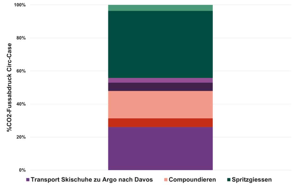 Die Ergebnisse für das Circ-Case zeigen, dass der grösste Anteil des CO2-Fussabdrucks beim Spritzgiessen anfällt. Am zweitstärksten fällt der Transport der gefüllten Skischuhpaletten zu Argo nach Davos ins Gewicht, welcher anteilsmässig auf die einzelne Circ-Case Handyhülle rückgerechnet wird. Der Beitrag der einzelnen Prozessschritte ist in Abbildung 3 dargestellt. Für eine bessere Übersicht sind in der Legende nur Prozessschritte mit einem Beitrag grösser als 5% angegeben.