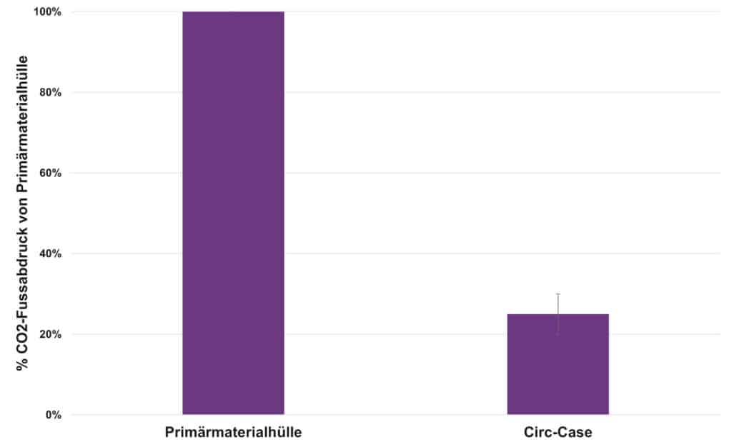 Um die Aussage der CO2-Fussabdruckberechnung zu überprüfen, wurden die Umweltauswirkungen zusätzlich mit der Methode der ökologischen Knappheit und der Environmental Footprint Methode berechnet. Auch hier bestätigt sich der Trend: Die Umweltbelastungen des Circ-Case liegen mit beiden Methoden um mindestens 70% niedriger als jene der Primärmaterialhülle. Der Indikator „Klimawandel“ (CO₂-Fussabdruck) macht dabei in beiden Fällen über die Hälfte der Gesamtwirkung aus und erweist sich damit als verlässliche Kenngrösse für diesen Anwendungsfall.