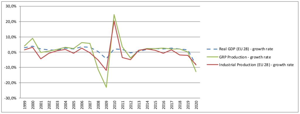 Die Composites-Produktionsmenge besteht nach wie vor zu etwa 95 % aus glasfaserverstärkten Kunststoffen. Die beiden Hauptanwendungsbereiche bilden der Transport- und der Bau-/Infrastrukturbereich, die zusammen mehr als 70 % des Produktionsvolumens ausmachen. Die hohe, auch gesamtwirtschaftliche Bedeutung der beiden Haupteinsatzgebiete von GFK ist auch ein Grund für eine starke Abhängigkeit der Composites-Industrie von der gesamtwirtschaftlichen Entwicklung. Abbildung 2 stellt wesentliche Wirtschaftsindikatoren der Composites-Marktentwicklung gegenüber. Es ist klar ersichtlich, dass die GFK-Produktion in der langfristigen Betrachtung tendenziell der Entwicklung des Bruttoinlandsproduktes und der gesamten Industrieproduktion folgt.