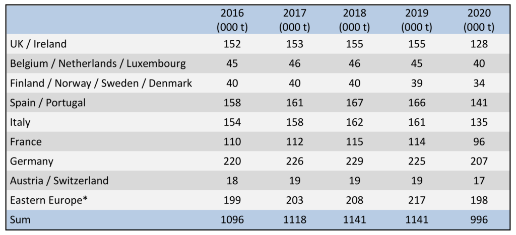 Generell sind von diesem Rückgang alle europäischen Regionen und alle erfassten Anwendungs-/Nutzungsbereiche betroffen. Im Detail stellen sich die Rückgänge jedoch höchst unterschiedlich, sowohl regional als auch anwendungs-/produktionsseitig dar. Während der Gesamtmarkt gegenüber dem Vorjahr um 12,7 % auf ein Niveau von 996 Kilotonnen (kt) absackte, lag die Entwicklung in den betrachteten Ländern zwischen -8 % und -17,4 %. Tabelle 1 zeigt die Entwicklungen der einzelnen Länder/Regionen im Detail.