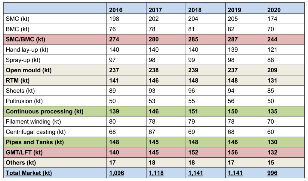 Seit dem 27. Januar 2020 begann sich das neuartige Coronavirus nach Asien auch in Europa und weltweit auszubreiten. Ab dem 11. März 2020 stufte die WHO die Verbreitung der Krankheit als Pandemie ein. Der Lockdown in Europa und Deutschland folgte und mit ihm massive Einschnitte für die Bevölkerung, die Industrie und die Wirtschaft generell. Die Auswirkungen sind die schwersten seit der Wirtschafts- und Finanzkrise 2008/2009. Abbildung 1 zeigt die Entwicklung der gesamten europäischen Menge von Glasfaserverstärkten Kunststoffen (GFK). Der Rückgang der europäischen GFK-Produktionsmenge beträgt 12,7 %. Der gesamte europäische GFK-Markt umfasst damit ein Volumen von 996 Kilotonnen (kt).