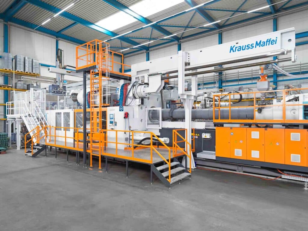 Utz fertigt intelligente Logistik- und Verpackungslösungen wie Paletten, Boxen und Paloxen für unterschiedlichste Branchen. Je höher deren Ansprüche an Rückverfolgbarkeit und automatisches Handling, desto smarter müssen die Behältnisse sein. Genügte es früher an einer Seite einen Barcode anzubringen, so braucht es heute an jeder Seite einen sowie oft zusätzlich applizierte RFIDs oder IML- Barcodes. Das aufgedruckte Kundenlogo ist eine Selbstverständlichkeit. Damit diese und weitere nachgelagerte Produktionsschritte nicht zum ärgerlichen Flaschenhals werden, hat das Team von Utz und KraussMaffei der MX 4000 eine anspruchsvolle und zweistöckige Automation mitgegeben, die alle Prozessschritte innerhalb der Zyklustaktzeit realisiert.