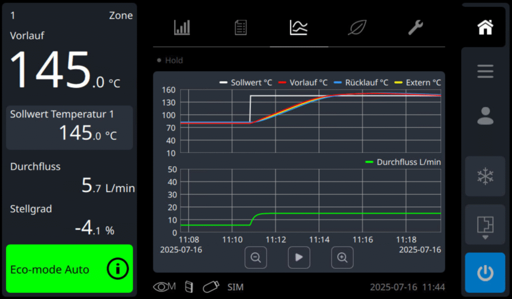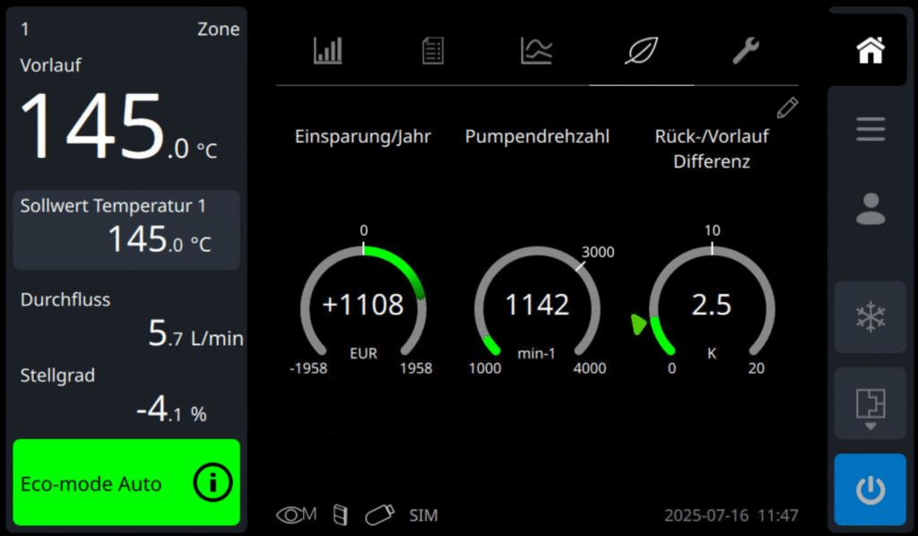 Ein zentrales Element der energieeffizienten Temperierung ist das Auffinden des optimalen Betriebspunktes, also die präzise Steuerung und Anpassung der Pumpenkennlinie. Dabei wird mithilfe einer drehzahlgeregelten Pumpe der gewünschte Durchfluss mit minimalem Energieaufwand erreicht. Der «Energy-Control Assistant» ermöglicht die Aktivierung voreingestellter Eco-Modi, um den Energieeinsatz der Geräte durch automatische Ermittlung des optimalen Betriebspunkts zu minimieren.