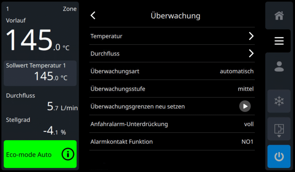 Die kontinuierliche Überwachung von Temperierprozessen ist ein wesentlicher Faktor zur Steigerung der Energieeffizienz. Sie ermöglicht die fortlaufende Kontrolle relevanter Parameter wie Temperatur, Durchfluss, Druck und weiterer prozesskritischer Grössen. Durch die Analyse dieser Daten können in Echtzeit Anpassungen vorgenommen werden, um den Energieeinsatz bei höchster Prozesssicherheit kontinuierlich zu optimieren (Bild 4).