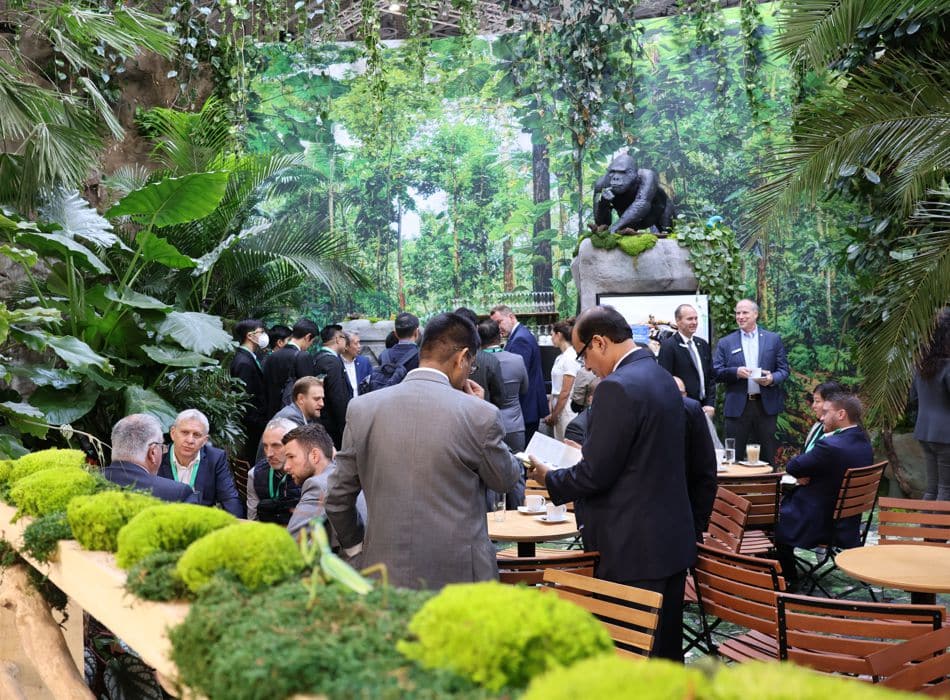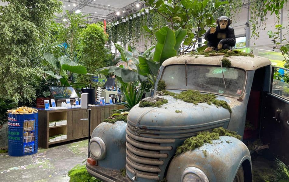 Vom 19.- 26. Oktober fand die K, die grösste Messe für die Kunststoff- und Kautschukindustrie in Düsseldorf statt. Mehr als 3.000 Unternehmen aus 60 Nationen präsentieren den 176.000 Fachbesuchern aus aller Welt neue Produkte, Anlagen und Maschinen. Die K findet alle drei Jahre statt. Röchling überrascht seine Kunden und Besucher jedes Mal mit einem spektakulär anderen Messestand. „In diesem Jahr drehte sich alles um das Thema Nachhaltigkeit. Daher haben wir ein Standkonzept entwickelt, das dieses wichtige Thema exzellent widerspiegelt“, so Lübbers. Besucher fanden sich inmitten eines Urwaldes mit echten Pflanzen, authentischen Tieren und einer besonderen Geräuschkulisse wieder. Spannende Eyecatcher waren ein Oldtimer, ein lebensgrosser Gorilla, Schimpansen und ein Orang-Utan in den Bäumen.