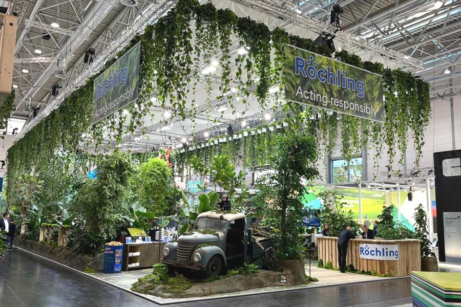 Ein plätschernder Wasserfall, tropische Pflanzen entlang des Weges und exotische Tiere im Dickicht – ein aussergewöhnliches Bild bot sich den Besuchern der diesjährigen Kunststoffmesse K in Düsseldorf. Auf 330 Quadratmetern präsentierte Röchling inmitten eines Urwaldes seine nachhaltigen Produktfamilien sowie innovative neue Produkte.