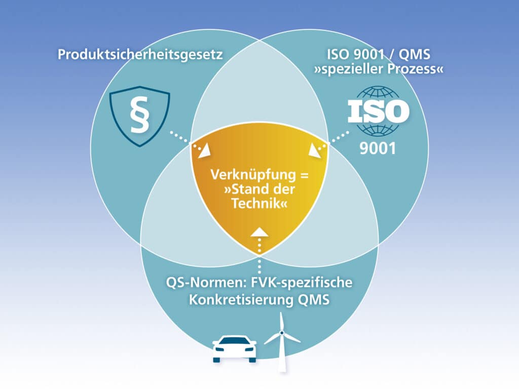 Der rechtliche Rahmen wird dabei durch das Produktsicherheitsgesetz (ProdSG) gesetzt. Dessen zentrale Anforderung – den „Stand der Technik“ umzusetzen – füllt die DIN 35255 konkret für Composites aus. Sie geht aber noch einen Schritt weiter: Da Composite-Bauteile nicht vollständig zerstörungsfrei geprüft werden können, gelten ihre Herstellung und Instandsetzung als „spezielle Prozesse“ im Sinne der ISO 9001. Während die ISO 9001 lediglich die Rahmenbedingungen vorgibt, liefert die neue DIN 35255 hierzu die notwendige technologiespezifische Konkretisierung – analog zu den Normen der Schweiss- und Klebtechnik. Damit erleichtert sie den praxisnahen Zugang zum „Stand der Technik“ durch die Kombination von Produktsicherheitsgesetz, ISO 9001/QMS und die FVK-spezifische QMS-Konkretisierung.