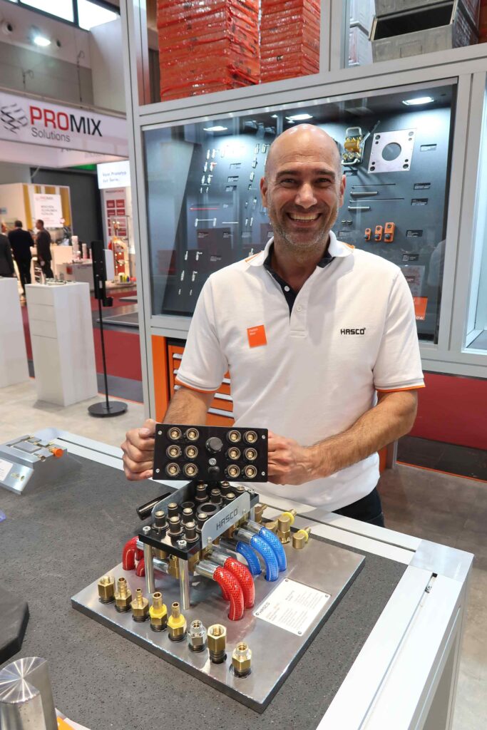Zu den zahlreichen neuen Produkten im Heisskanal- und Normalienbereich von Hasco zählt auch das neue Multikupplungssystem. Damit lassen sich Spritzgiesswerkzeuge schnell an die Temperierung ankuppeln. «Es geht mit einem Klick. Eine Verwechslung der einzelnen Schläuche ist ausgeschlossen und das macht es für den Kunden sehr effizient, schnell und sicher. Das System kommt im Temperierbereich sehr, sehr gut an», betont Patrick Mast, zuständig für die Hasco-Kunden in der Schweiz. Die Kupplung gibt es als 6, 12 und 20-fach System.