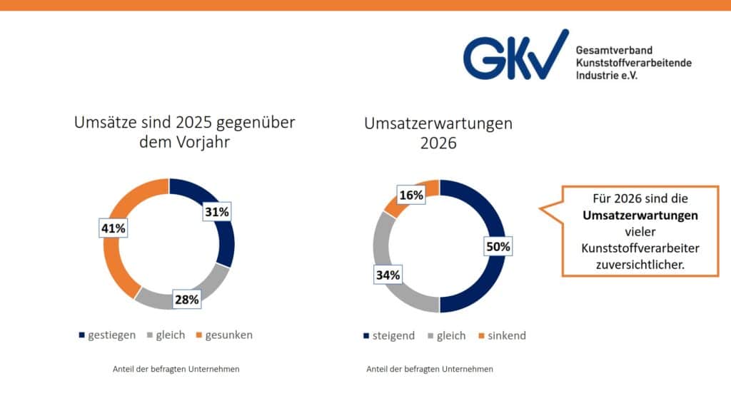 Die Umsätze der Kunststoff verarbeitenden Industrie in Deutschland gingen im Jahr 2025 im Vergleich zum Vorjahr nochmals um 1,8 Prozent zurück. Der Branchenverband GKV rief Bundesregierung und Europäische Kommission zu tiefgreifenden Wirtschaftsreformen und Bürokratieabbau auf.