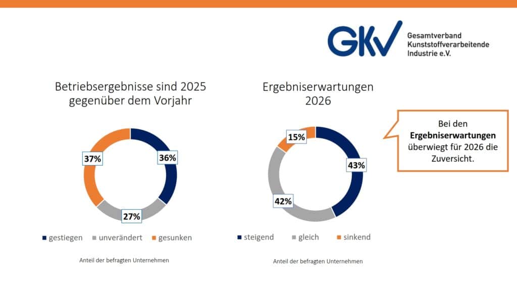 Die Umsätze der befragten Unternehmen im Jahr 2025 bestätigen den in den amtlich erhobenen Daten ausgewiesenen Umsatzrückgang. Für 2026 erwartet die Hälfte der befragten Unternehmen ein Umsatzplus. Erfüllten sich die Erwartungen, könnte die Kunststoff verarbeitende Industrie in Deutschland erstmals seit 2022 ein Umsatzplus erreichen. Die Betriebsergebnisse der Kunststoffverarbeiter zeigten 2025 ein durchwachsenes Bild. Bezüglich der Ergebniserwartungen im Jahr 2026 überwiegt die Zuversicht.