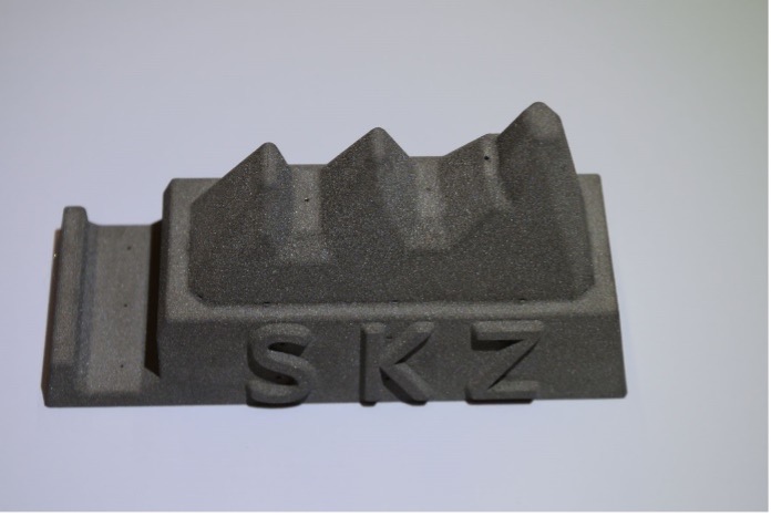 Daraus entstand die Form eines „Gebirges“, das auf einem Sockel steht, der das Logo des SKZ zeigt und die ganz praktische Zusatzfunktion einer Handyhalterung aufweist. Da die Werkzeugkonstruktion nicht durch die verfügbaren Fräsverfahren hergestellt werden konnte, wurde sie über das 3D-Druckverfahren von Headmade Materials hergestellt. Mit der Hilfe von Christian Fischer (einer der Gründer von Headmade Materials) konnte das Projektteam noch den letzten Feinschliff an der Konstruktion vornehmen. Das Werkzeug wurde dann bei Headmade Materials aus dem widerstandsfähigen Titanwerkstoff Ti6Al4V 3D-gedruckt und anschließend vom Projektteam mit Rahmen, Grundplatte und dem sog. „Vorstrecker“ in der bestehenden Maschine installiert.