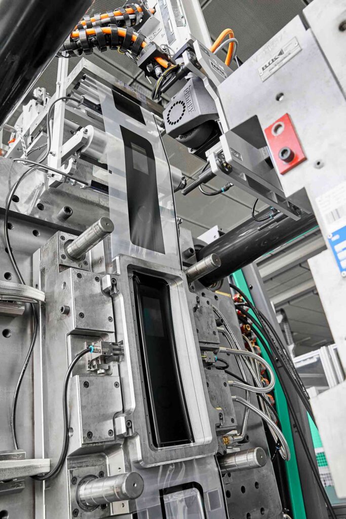 Für eine präzise Taktung genügt ein einfacher Signalaustausch zwischen Spritzgiessmaschine und Folienvorschubgerät. Vor jeder Weitertaktung wird der Klemmrahmen auf der beweglichen Auswerferseite mit angehoben. Die exakte Positionierung der an ihren Rändern mit Passermarken versehenen Trägerfolie im Werkzeug erfolgt über optische Sensoren. Dann bewegt sich der Klemmrahmen mit Dichtlippe wieder in die Ausgangsposition, während die Folie über Vakuum in der Kavität fixiert und mit MABS hinterspritzt wird. In Zusammenwirkung von Druck und Temperatur löst sich während des Spritzgiessvorgangs das Dekorelement – in diesem Fall schwarzer Hochglanzlack – von der Trägerrolle und wird haftfest auf die Kunststoffoberfläche der Blende übertragen. Das 145 Gramm schwere Fertigteil wird über einen hydraulischen Kernzug auf der Düsenseite ausgeworfen. Die schonende Übernahme und Ablage auf ein Förderband übernimmt ein lineares Robot-System Multilift V 40 mit Vakuumsaugern. Die Lackschicht des Fertigteils kann bei Bedarf z. B. direkt auf dem Förderband durch eine UV-Härtung geführt und montagefertig ausgeschleust werden. Nachfolgende Prozessschritte sind nicht erforderlich.