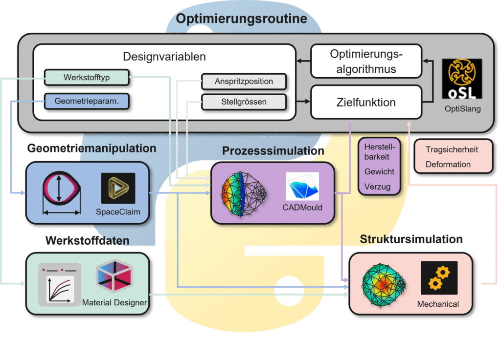 Bild 1: Schema der automatisierten Optimierungsroutine für kurzfaserverstärkte Spritzgussbauteile mit Ansys und CADMould (Bilder: IWK)