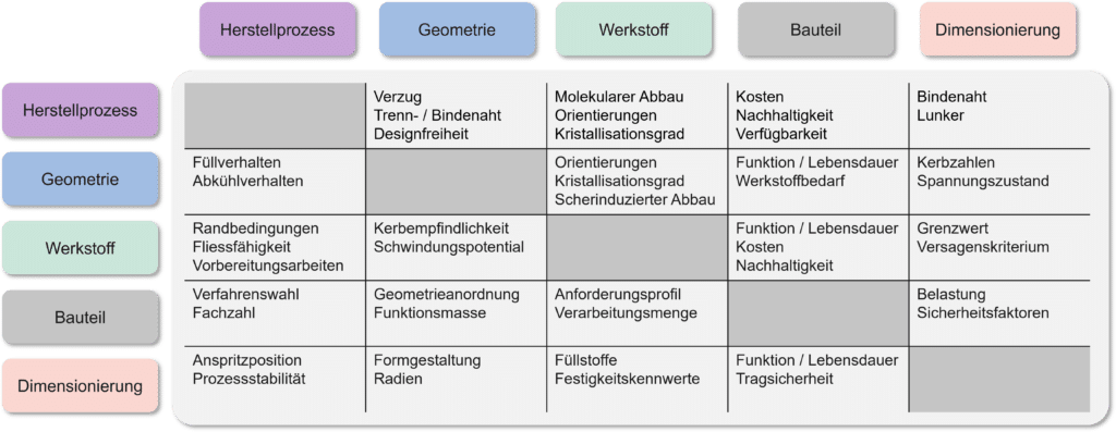 Bild 2: Komplexität der Dimensionierung von Spritzgussbauteilen aufgrund der Wechselwirkungen unter den Einflussgrössen.