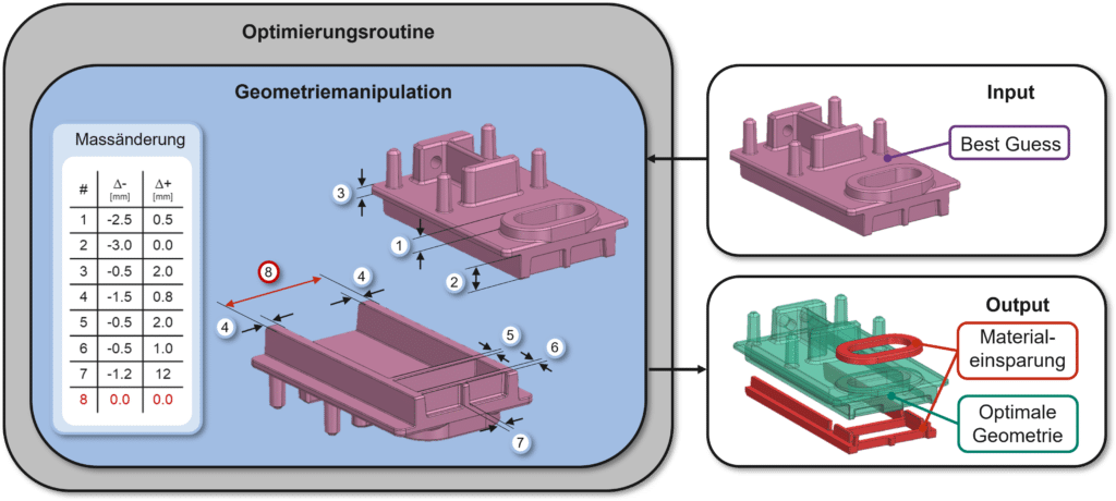 Bild 3: Materialeinsparung an der Profilaufnahme durch den Einsatz der automatisierten Optimierungsroutine [3].