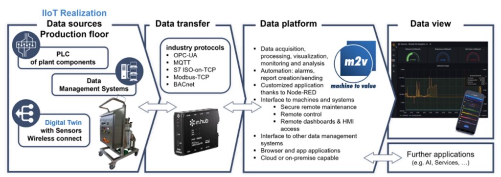 - m2v-Plattform: Zentrale Datenmanagement- und Visualisierungslösung. Speicherung und Analyse aller relevanten Maschinenparameter mit anpassbaren Dashboards und automatisierten Reports. Die Digitale Akte ermöglicht eine lückenlose Dokumentation aller Produktions- und Wartungsprozesse.