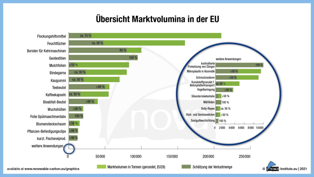 Das Ergebnis des Projektes ist eine Broschüre für Entscheidungsträger aus Industrie und Politik aber auch für die breite Öffentlichkeit, mit 25 Produktsteckbriefen und umfangreicher Hintergrundinformation zum Thema biologischer Abbau. Für jedes Produkt wird erklärt, inwiefern der biologische Abbau eine sinnvolle und machbare Option ist und welche technischen Substitutionsmöglichkeiten es für einen nachhaltigeren Materialeinsatz gibt. Zudem wurden politische Rahmenbedingungen und Regularien beleuchtet und produktspezifisch ausgewertet. Erstmalig wurden auch die Marktvolumina für Deutschland und die EU erhoben und abgeschätzt. Das Gesamtvolumen der 25 Anwendungen liegt in Deutschland bei rund 170.000 Tonnen und in der Europäischen Union sogar bei etwa 1 Million Tonnen (siehe Grafik), von denen der grösste Anteil in die Umwelt gelangt. Hier würde der Einsatz biologisch abbaubarer Materialien erhebliche Umweltvorteile bringen.