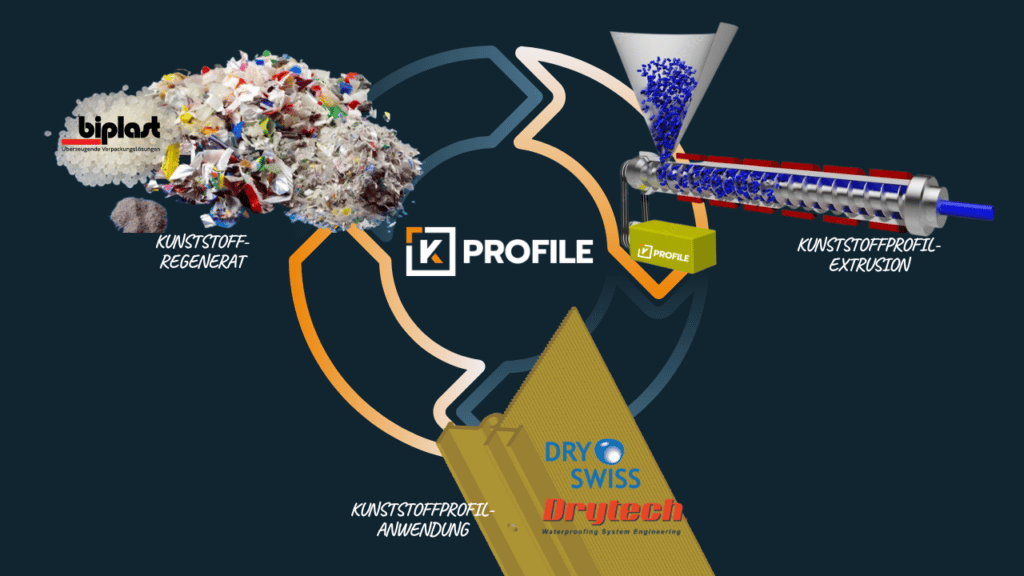 K-Profile fertigt aus dem sortenreinen Produktionsabfall ein Kunststoffprofil, welches im Bereich der Bauwerksabdichtung von den Unternehmen Drytech Swiss und Drytech Germany genutzt wird.
