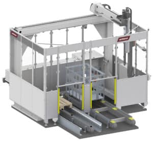 In dieser Anwendung werden Traystapel mittels einer horizontalen Servoachse von einem Puffer hinter der Palettierzelle zum Arbeitsbereich des Top-entry Roboters gebracht. Ein neuentwickelter W938T Roboter mit vorgelagerter Entformachse und B-Servo-Rotationsachse übernimmt die Trays. Bevor diese auf einer Europalette [1.200 × 800 mm] bzw. in einer DB Gitterbox [1.240 × 835 × 970 mm] abgestapelt werden, wird über eine optische Kontrolle die Ausrichtung geprüft. Im Anschluss erfolgt die Positionierung auf dem Transportgebinde entsprechend den Vorgaben im Ablageprogramm. In weiterer Folge wird anhand dieser Zelle demonstriert, wie zwei Fördersysteme des Unternehmens ErgoTek die befüllte Palette bzw. DB Gitterbox in die Schutzeinhausung hinein- und aus dieser herausfahren.