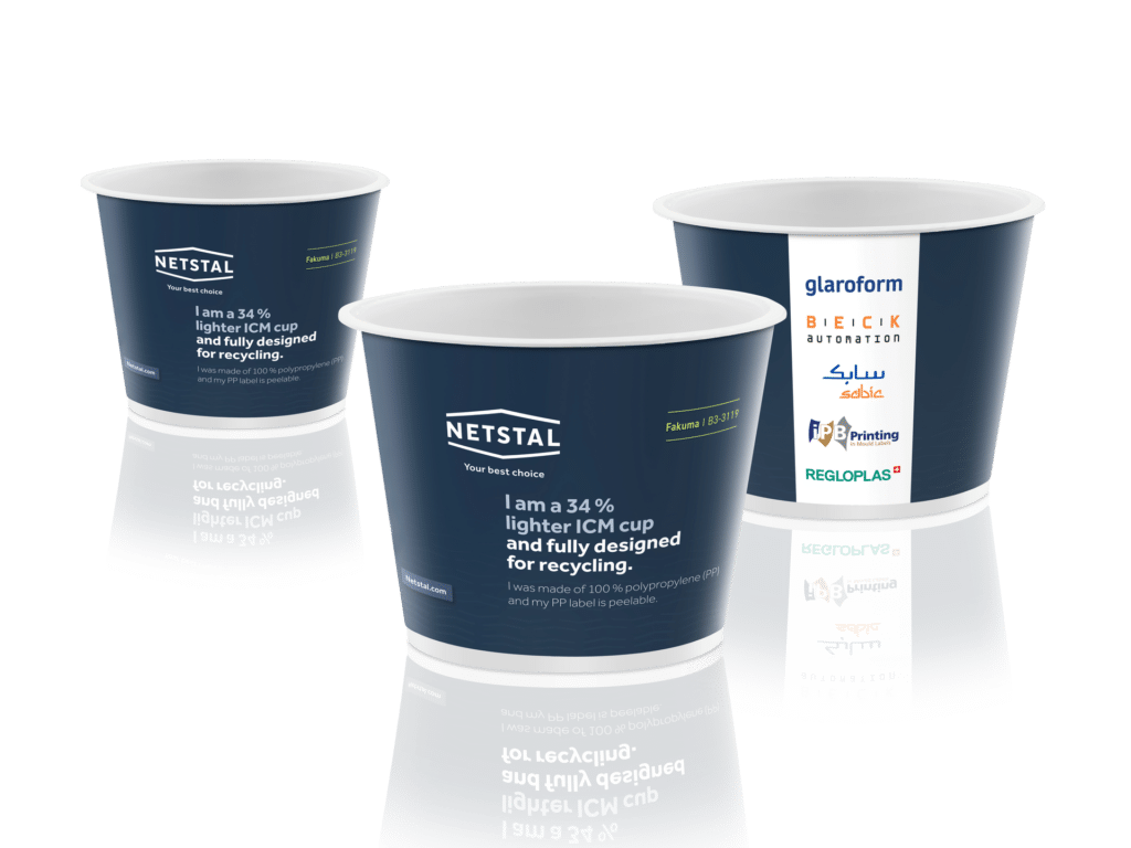 Er ist federleicht, der Joghurtbecher, den Netstal auf der Fakuma präsentiert. Die weiteren Eckdaten: Füllvolumen 200 g, Teilegewicht 5,4 g, Wandstärke 0,3 mm. Da Becher und Label zu 100 % aus Polypropylen (PP) bestehen, ist die Verpackung besonders gut im Recycling verwertbar. Im Gegensatz zu einem konventionellen In-Mold-Label löst sich das Label im mechanischen Recyclingprozess ab. Dieser beeinträchtigt den PP-Stream nicht, weil Druckfarbenpartikel zuverlässig vom reinen PP separiert werden. Mit dem Spritzprägeverfahren (Injection Compression Molding, kurz ICM) verringert sich das Gewicht des Bechers um beachtliche 34 %. Eine weitere Verbesserung in Sachen Nachhaltigkeit: Aus der Kombination des ICM-Verfahrens und einer Produktoptimierung ergibt sich zusätzlich ein um 27 % reduziertes Packvolumen.