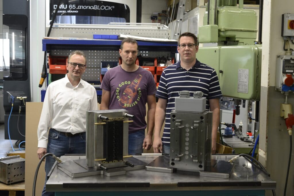 Im Werkzeugbau von elm-plastic: Entwicklungsleiter Roman Möhs, Produktionsleiter Timo Dedisch mit Stephan Hatarik/Technischer Verkäufer Hasco hot runner (v.r.)
