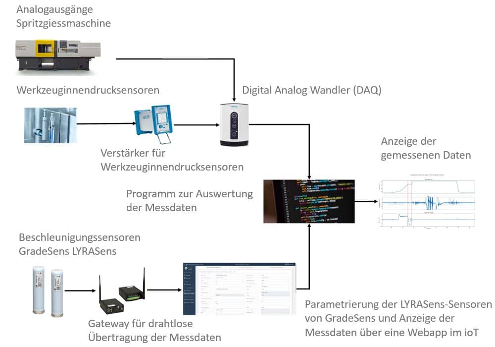 Das Institut iRAP der Hochschule für Technik und Architektur Freiburg arbeitet zusammen mit dem Unternehmen GradeSens AG an einer vollständig neuen Herangehensweise, um mit Sensoren den kompletten Spritzgiessprozess zu überwachen. Der innovative Ansatz basiert auf Beschleunigungssensoren, welche an ein Spritzgiesswerkzeug angebracht werden.