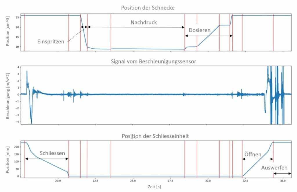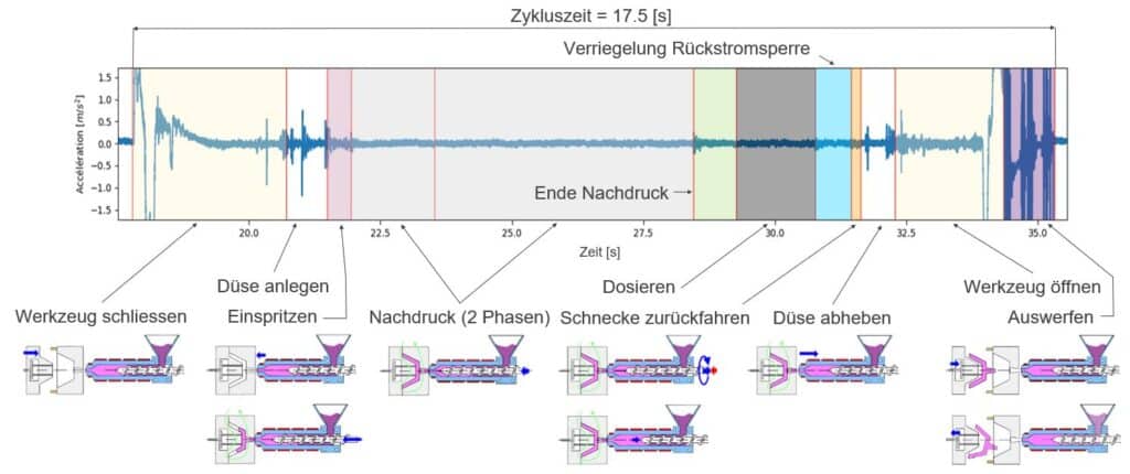 Schritt für Schritt konnten die verschiedenen Phasen des Spritzzyklus dem Signal des Beschleunigungssensors zugeordnet werden (Bild 2).