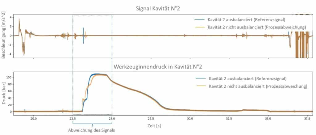 In ersten Vorversuchen konnten im Signal der Beschleunigungssensoren jedoch klare Druckveränderungen in den Kavitäten eines 2-fach Spritzwerkzeugs erkannt werden (z.B. bei einem nicht ausbalancierten Füllen) (Bild 4). Um solch eine Prozessabweichung feststellen zu können, werden die Signale der Beschleunigungssensoren immer in Bezug auf ein Referenzsignal betrachtet.