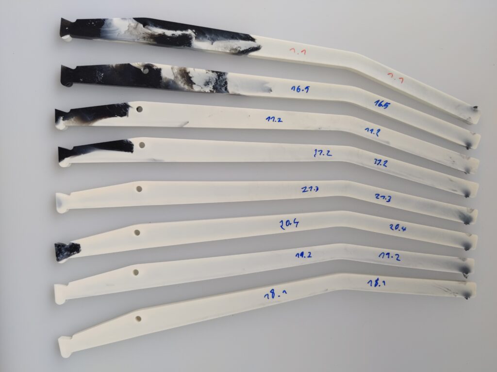 Die Hebel aus den Versuchen 1 bis 8 sind in Bild 1 dargestellt. Äusserlich fallen zwei Fehlerbilder auf. Einmal das Durchschimmern des Kernmaterials am Anguss und je nach Versuch das Durchbrechen des Kernmaterials in die Hülle. Dabei waren die Fehlerbilder reproduzierbar und alleine von den Spritzgiessparametern abhängig. Die Versuche 7 und 8 ergaben Hebel mit einer geschlossenen Hülle.