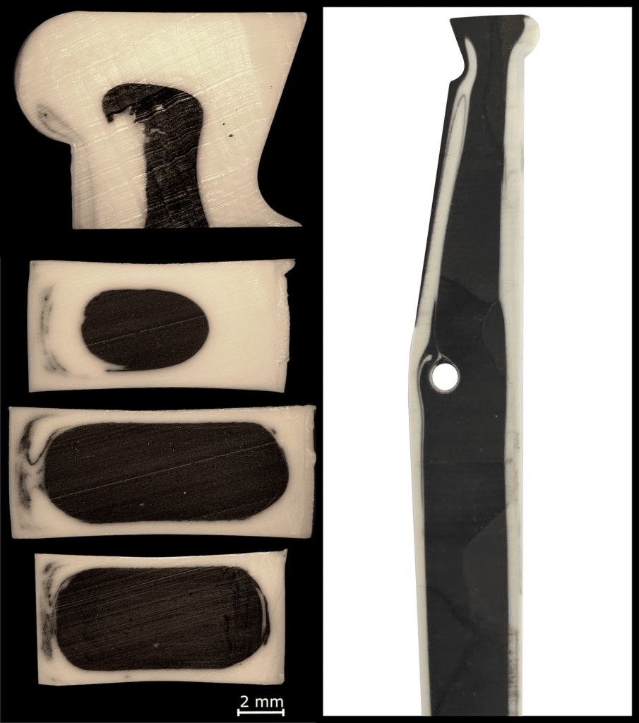 Die Querschnitte entlang des Hebels aus Versuch 8 zeigen, dass der Kern zur Spitze des Hebels dünner wird, aber dennoch bis in die Spitze des Hebels reicht. In den Versuchen 1 bis 6 hat das Massepolster der Hülle nicht ausgereicht. Deshalb konnte das Kernmaterial die Hülle durchbrechen und auf der Werkzeugoberfläche zurückströmen (Abbildung 2 rechts).