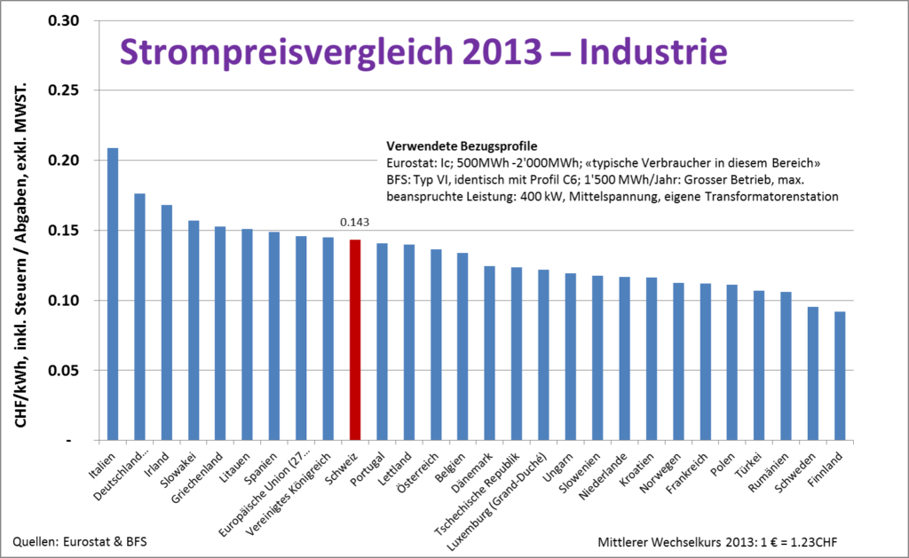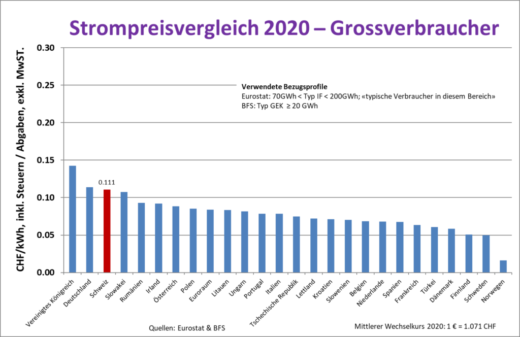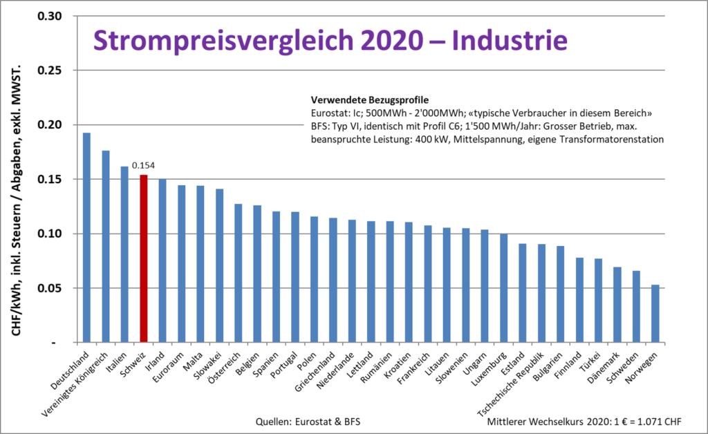 n der energiepolitischen Diskussion ist wiederholt von relativ günstigen Schweizer Strompreisen zu hören. Auf welcher Basis solche Aussagen beruhen, kann nicht immer nachvollzogen werden. In den offiziellen Statistiken der EU und der Schweiz gehört unser Land zu den teuren Standorten. Die Preise für KMU, mittelgrosse Industrieunternehmen und Grossverbraucher befinden sich regelmässig im oberen Drittel des Preisvergleichs. Das belegen auch die Grafiken. Vergleicht man die Strompreise beispielsweise mit Skandinavien, wo der Strom wie hierzulande mit Wasser- und Kernkraft produziert wird, stellt man einen signifikanten Unterschied fest. Teurer als in der Schweiz ist der Strom nur noch in Ländern, die entweder wie Deutschland hohe Förderabgaben haben oder teure fossil betriebene Kraftwerke, wie beispielsweise Italien.