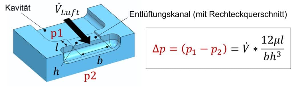 Die Geometrie eines Entlüftungskanals hat einen grossen Einfluss auf den Druckverlust (Bild 2), den die durchströmende Luft überwinden muss, um aus der Kavität zu entweichen. Je grösser dieses «Hindernis» umso stärker wird die Luft komprimiert und erhitzt. Insbesondere bei Luftkanälen mit geringen Kanaltiefen, kombiniert mit gleichzeitig schnellem Einspritzen, wird die Luft sehr stark komprimiert und erhitzt. Die dabei auftretenden Temperaturen können die Zersetzungstemperatur vom verarbeiteten Kunststoff deutlich überschreiten, was auf dem Bauteil zu den eingangs erwähnten Spritzgiessfehlern führt.