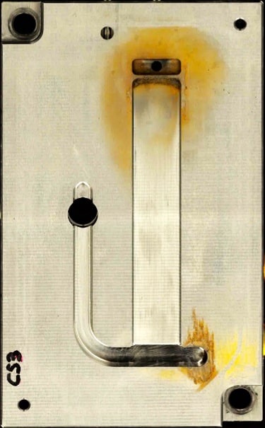 In einem zweiten Schritt konnten die Ergebnisse aus dem Simulationsmodell über Praxisversuche mit einem Testwerkzeug überprüft und verglichen werden. Dazu wurde eine Testgeometrie definiert und ein modulares mit Instrumenten versehenes Spritzwerkzeug entwickelt und hergestellt. Verschiedene Entlüftungskonzepte konnten in diesem Werkzeug über Spritzgiessversuche getestet werden. Nebst visuellen Aspekten wie Verbrennungen, Glanzstellen und Gratbildungen, wurde auch die austretende Luft gemessen (Bild 3 + 4). Damit konnte die Leistung und Effizienz der verschiedenen getesteten Entlüftungskonzepte beurteilt werden.