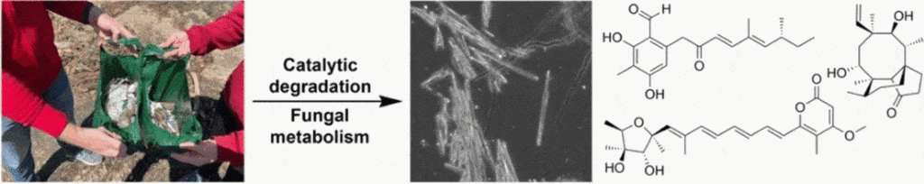 Das Team um Travis J. Williams und Clay C. C. Wang an der University of Southern California (Los Angeles) sowie Berl Oakley an der University of Kansas (Lawrence) stellt jetzt einen kombinierten chemisch-biologischen Ansatz vor, mit dem ein Upcycling von PE-Abfällen zu wertvollen und komplexen pharmakologisch interessanten Verbindungen gelingt. Im ersten Schritt setzt das Team das PE katalytisch mit Sauerstoff bei 150 °C zu verschiedensten Dicarbonsäuren (Kohlenwasserstoffketten mit zwei Säuregruppen) um. Diese werden im zweiten Schritt an Pilze „verfüttert“, die daraus interessante Naturstoffe machen. Dies konnte das Team u.a. an realen PE-Abfällen aus dem Nordpazifikwirbel zeigen.