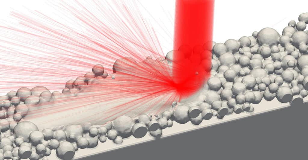 Das Besondere: Die Forschenden haben dazu verschiedene Simulationsmethoden aneinandergehängt. Mit der Diskrete-Elemente-Methode simulieren sie zunächst, wie die einzelnen Pulverpartikel mithilfe eines speziellen Werkzeugs, der Rakel, in den Bauraum eingebracht werden. Die darauffolgende »Smoothed Particle Hydrodynamics« simuliert das Aufschmelzen der Pulverpartikel – berechnet werden sowohl Laserinteraktion und Wärmetransport als auch die Oberflächenspannungen, die zum Fliessen der Schmelze führen. Auch die Schwerkraft und der Rückstossdruck, der entsteht, wenn das Material verdampft, gehen in die Berechnung mit ein.