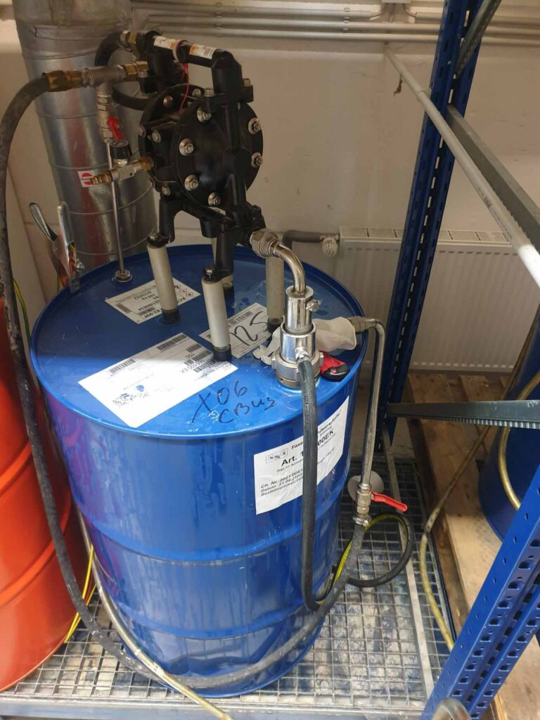 Für das leicht dickflüssige Trennwachs ist eine Druckluft-Membranpumpe das Fördermittel der Wahl. Je nach Temperatur des Fasses kann die Konsistenz so zäh ausfallen, dass auch die Druckluft-Membranpumpe an ihre Grenzen kommt. Nach dem Bau einer Wärmekammer in der der Fassinhalt etwas über Raumtemperatur erwärmt wird, arbeitet die Pumpe absolut problemlos. Sie verkraftet Feststoffpartikel bis zu 2,4 mm Durchmesser bei einem maximalen Förderstrom von 55 l/min und max. 7 bar Förderdruck. Bei normal viskosen Medien liegt die Ansaughöhe trocken bei 3 m, produktgefüllt max. 7,6 m. Die Viskositätsspannweite beträgt 1 bis 15.000 mPas. Je nach Anforderung ist die trockenlaufsichere Pumpe aus Polypropylen, Edelstahl, Aluminium oder leitfähigem Acetal gefertigt und kann so leicht brennbare Medien ebenso fördern wie abrasive oder aggressive Flüssigkeiten.