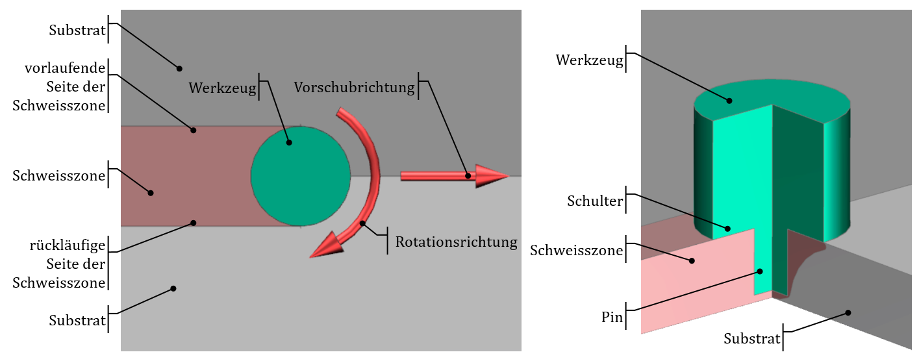 In dem im Bild 1 dargestellten Beispiel, werden zwei Substrate in Form von Platten miteinander auf Stoss verschweisst. Während des Schweissprozesses rotiert das Werkzeug um die eigene Achse und führt gleichzeitig eine Vorschubbewegung in Schweissrichtung aus. Dabei wird das Substratmaterial vor dem Werkzeug geschert und es entsteht Reibung, wodurch sich der thermoplastische Kunststoff erwärmt. Das erwärmte und plastifizierte Material wird in die Schweisszone hinter das Werkzeug gedrängt und verrührt. Daher hat das Verfahren den Namen Reibrührschweissen.
